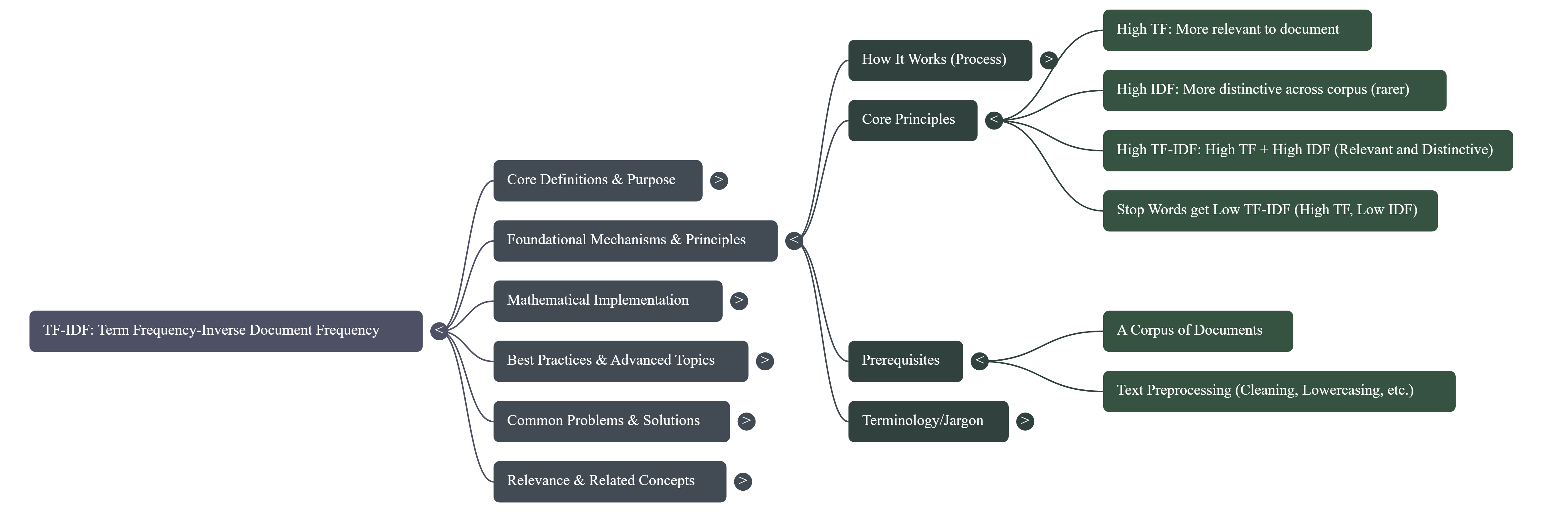 - High TF, High IDF: Term appears frequently in a specific document and rarely in others. This results in a high TF-IDF score, indicating strong relevance and distinctiveness for that document. (e.g., "quantum entanglement" in an article about quantum physics).